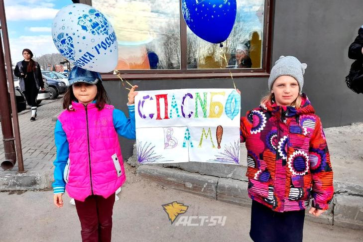 Видео с проезжающей колонной появилось вечером 26 апреля в паблике АСТ-54. На записи слышно, как водители автобусов приветственно сигналят встречающим их женщинам и детям.