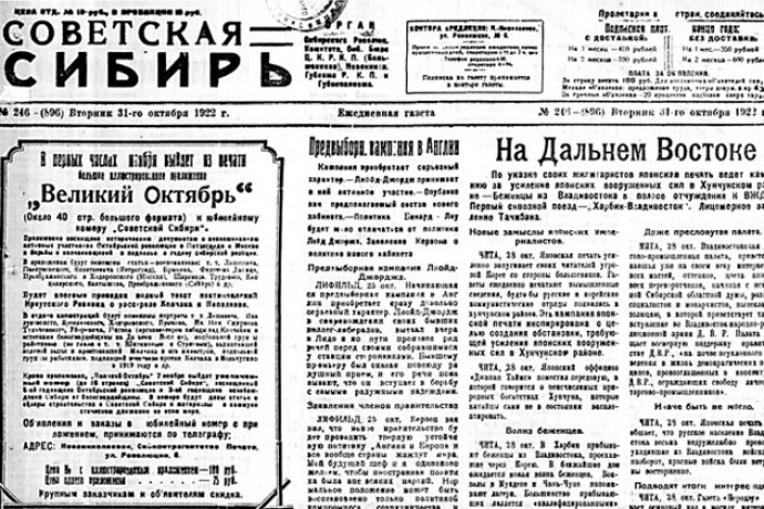 На сайте Новосибирской государственной областной научной библиотеки начали выкладывать отсканированные страницы «Советской Сибири», начиная с года ее основания — 1919-го. Оцифровка завершится к 100-летию газеты — 1 октября. Но уже сейчас читателям доступны публикации более чем за полвека, вплоть до 1970-го.