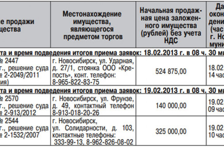 Срок приема заявок — с момента опубликования по 15.02.2013 г. (включительно) в рабочие дни с 9:00 до 12:00 по адресу: г. Новосибирск, ул. Коммунистическая, 50, этаж 3, кабинеты № 4, 6, ознакомление с предметом торгов — ежедневно с момента опубликования сообщения самостоятельно. Шаг аукциона составляет 5 % от начальной стоимости имущества.