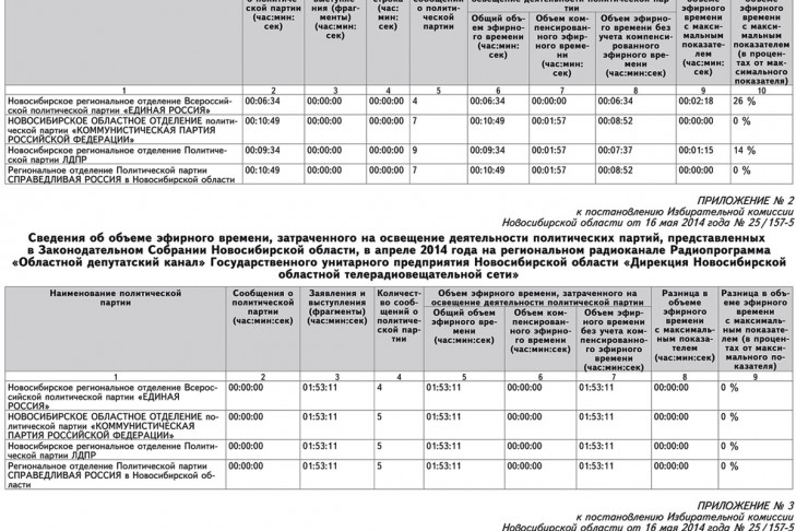 1. Утвердить результаты учета объема эфирного времени, затраченного на освещение деятельности каждой политической партии, представленной в Законодательном Собрании Новосибирской области, региональными телеканалом Телепрограмма «ОТС-ТВ» и радиоканалом Радиопрограмма «Областной депутатский канал» Государственного унитарного предприятия Новосибирской области «Дирекция Новосибирской областной телерадиовещательной сети» в апреле 2014 года (приложения № 1, № 2 - см. Таблицу 1).