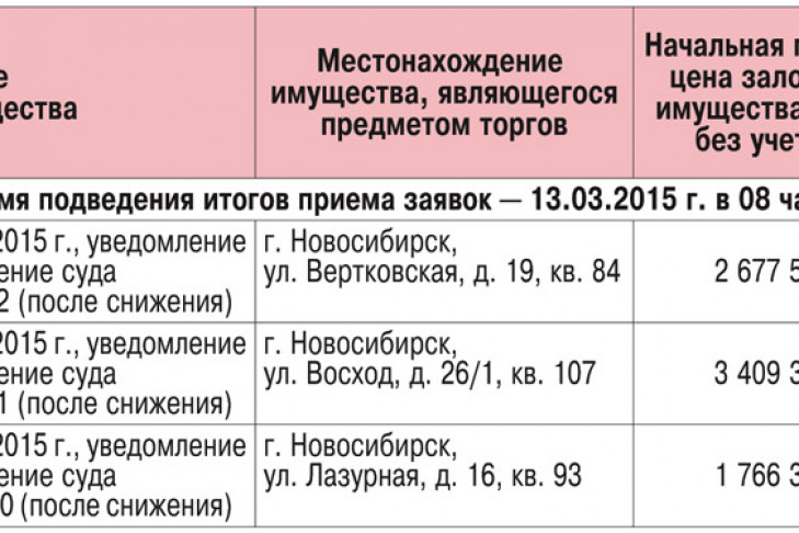 Срок приема заявок — с момента опубликования по 10.03.2015 (включительно) в рабочие дни с 09:00 до 13:00 по адресу: г. Новосибирск, ул. Кропоткина, д. 271, этаж 4, кабинет № 404, тел. 319-89-66. Ознакомление с предметом торгов — ежедневно с момента опубликования сообщения самостоятельно. Порядок оформления участия в торгах, проводимых ООО «АТМ-ГРУПП»: К участию в торгах допускаются юридические и физические лица, своевременно подавшие заявки на участие в аукционе и представившие документы в соответствии с перечнем, объявленным в настоящем извещении о проведении торгов, а также обеспечившие поступление установленного размера задатка в сроки и порядке, указанные в договоре о задатке, заключаемом с Организатором торгов. Документы, предоставляемые для участия в аукционе: Заявка установленного образца; опись документов (в двух экземплярах); платежный документ, подтверждающий внесение задатка на счет продавца; заверенные в соответствии с действующим законодательством: копии учредительных документов и копия свидетельства о регистрации (оригинал или нотариально заверенная), бухгалтерский баланс, заверенный налоговым органом, на последнюю отчетную дату, выписка из ЕГРЮЛ (оригинал или нотариально заверенная), протокол о назначении исполнительного органа, решение уполномоченного органа об участии в торгах (для юридических лиц — резидентов РФ); доверенность на лицо, уполномоченное действовать от имени заявителя при подаче заявки на участие в торгах; копии паспортов (для физических лиц); данные о лицевом счете в банке (для договора о задатке). Для участия в аукционе претендентам необходимо заключить с Организатором торгов договор о задатке. Такое сообщение является публичной офертой для заключения договора о задатке в соответствии со ст. 437 Гражданского кодекса РФ, а подача претендентом заявки и перечисление задатка являются акцептом такой оферты, после чего договор о задатке считается заключенным в письменной форме. Претендент приобретает статус участника торгов с момента оформления комиссией по проведению торгов протокола окончания приема и регистрации заявок. Задаток должен быть внесен заявителем на указанный счет ООО «АТМ-ГРУПП»: 630123, г. Новосибирск, Мочищенское шоссе, 1/4, ИНН 5402571162, КПП 540201001, ОГРН 1135476188066, р/с 40702810600400007732, филиал № 5440 ВТБ24 (ПАО), к/с 30101810450040000751 в ГРКЦ ГУ БАНКА РОССИИ ПО НОВОСИБИРСКОЙ ОБЛ., БИК 045004751, не позднее даты окончания приема заявок, указанной в извещении о проведении торгов, и считается внесенным с даты поступления всей суммы задатка на указанный счет. Участникам торгов, не ставшим победителями торгов, суммы внесенных ими задатков возвращаются в течение 5 (пяти) рабочих дней с даты проведения торгов. Порядок проведения аукциона: Торги начинаются с объявления минимальной начальной цены продажи объекта, которая повышается по мере выдвижения предложений в соответствии с шагом аукциона; выигравшим торги на аукционе (победителем торгов) признается лицо, предложившее наиболее высокую цену. Организатор торгов и победитель торгов подписывают протокол о результатах, имеющий силу договора, в день проведения торгов на основании оформленного решения комиссии об определении победителя торгов. Торги проводятся в соответствии со ст. 447 — 449 Гражданского кодекса Российской Федерации, ФЗ «Об ипотеке (залоге недвижимости)» от 16.07.1998