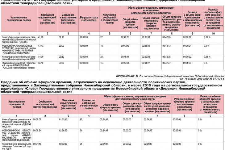 Заслушав информацию руководителя рабочей группы по установлению результатов учета объема эфирного времени, затраченного в течение одного календарного месяца на освещение деятельности каждой политической партии, представленной в Законодательном собрании Новосибирской области (далее — рабочая группа по установлению результатов учета объема эфирного времени), заместителя председателя Избирательной комиссии Новосибирской области Т.Г. Краткой и обсудив решение рабочей группы по установлению результатов учета объема эфирного времени от 14 апреля 2015 года № 4 «О результатах учета объема эфирного времени, затраченного на освещение деятельности каждой политической партии, представленной в Законодательном собрании Новосибирской области, региональными государственными телеканалом и радиоканалом в марте 2015 года», на основании пункта 1 части 2 статьи 2 Федерального закона «О гарантиях равенства парламентских партий при освещении их деятельности государственными общедоступными телеканалами и радиоканалами», статьи 6 Закона Новосибирской области «О гарантиях равенства политических партий, представленных в Законодательном собрании Новосибирской области, при освещении их деятельности региональными государственными телеканалом и радиоканалом», раздела VI Порядка учета объема эфирного времени, затраченного в течение одного календарного месяца на освещение деятельности каждой политической партии, представленной в Законодательном собрании Новосибирской области, региональными телеканалом и радиоканалом, утвержденного решением Избирательной комиссии Новосибирской области от 28 октября 2010 года № 51/577, Избирательная комиссия Новосибирской области постановляет:
