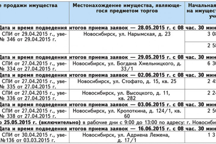 Организатор торгов — Территориальное управление Росимущества в Новосибирской области (г. Новосибирск, ул. Революции, 38, тел.: 223-87-28, 223-28-54) сообщает о проведении торгов в форме открытого аукциона по продаже арестованного (заложенного) имущества. Срок приема заявок — с момента опубликования по 01.06.2015 г. в рабочие дни с 9:00 до 13:00 по адресу: г. Новосибирск, ул. Коммунистическая, 50, этаж 3, кабинеты № 4, 6. от 16.05.2015
