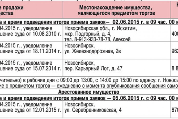 Срок приема заявок — с момента опубликования по 03.06.2015 г. (включительно) в рабочие дни с 09:00 до 13:00, с 14:00 до 15:00 по адресу: г. Новосибирск, ул. Кропоткина, д. 271, этаж 4, кабинет № 404. Тел. 319-89-66. Ознакомление с предметом торгов — ежедневно с момента опубликования сообщения самостоятельно. Порядок оформления участия в торгах, проводимых ООО «АТМ-ГРУПП»: К участию в торгах допускаются юридические и физические лица, своевременно подавшие заявки на участие в аукционе и представившие документы в соответствии с перечнем, объявленным в настоящем извещении о проведении торгов, а также обеспечившие поступление установленного размера задатка в сроки и порядке, указанные в договоре о задатке, заключаемом с организатором торгов. Документы, предоставляемые для участия в аукционе: Заявка установленного образца; опись документов (в двух экземплярах); платежный документ, подтверждающий внесение задатка на счет продавца; заверенные в соответствии с действующим законодательством: копии учредительных документов и копия свидетельства о регистрации (оригинал или нотариально заверенная), бухгалтерский баланс, заверенный налоговым органом, на последнюю отчетную дату, выписка из ЕГРЮЛ (оригинал или нотариально заверенная), протокол о назначении исполнительного органа, решение уполномоченного органа об участии в торгах (для юридических лиц — резидентов РФ); доверенность на лицо, уполномоченное действовать от имени заявителя при подаче заявки на участие в торгах; копии паспортов (для физических лиц); данные о лицевом счете в банке (для договора о задатке). Для участия в аукционе претендентам необходимо заключить с Организатором торгов договор о задатке. Такое сообщение является публичной офертой для заключения договора о задатке в соответствии со ст. 437 Гражданского кодекса РФ, а подача претендентом заявки и перечисление задатка являются акцептом такой оферты, после чего договор о задатке считается заключенным в письменной форме. Претендент приобретает статус участника торгов с момента оформления комиссией по проведению торгов протокола окончания приема и регистрации заявок. Задаток должен быть внесен заявителем на указанный счет ООО «АТМ-ГРУПП»: 630123, г. Новосибирск, Мочищенское шоссе, 1/4, ИНН 5402571162, КПП 540201001, ОГРН 1135476188066, р/с 40702810600400007732, Филиал № 5440 ВТБ24 (ПАО), к/с 30101810450040000751 в ГРКЦ ГУ Банка России по Новосибирской обл., БИК 045004751, не позднее даты окончания приема заявок, указанной в извещении о проведении торгов, и считается внесенным с даты поступления всей суммы задатка на указанный счет. Участникам торгов, не ставшим победителями торгов, суммы внесенных ими задатков возвращаются в течение 5 (пяти) рабочих дней с даты проведения торгов. Порядок проведения аукциона: Торги начинаются с объявления минимальной начальной цены продажи объекта, которая повышается по мере выдвижения предложений в соответствии с шагом аукциона; выигравшим торги на аукционе (победителем торгов) признается лицо, предложившее наиболее высокую цену. Организатор торгов и победитель торгов подписывают протокол о результатах, имеющий силу договора, в день проведения торгов на основании оформленного решения комиссии об определении победителя торгов. Торги проводятся в соответствии со статьями 447 — 449 Гражданского кодекса Российской Федерации, Федеральным законом «Об и
