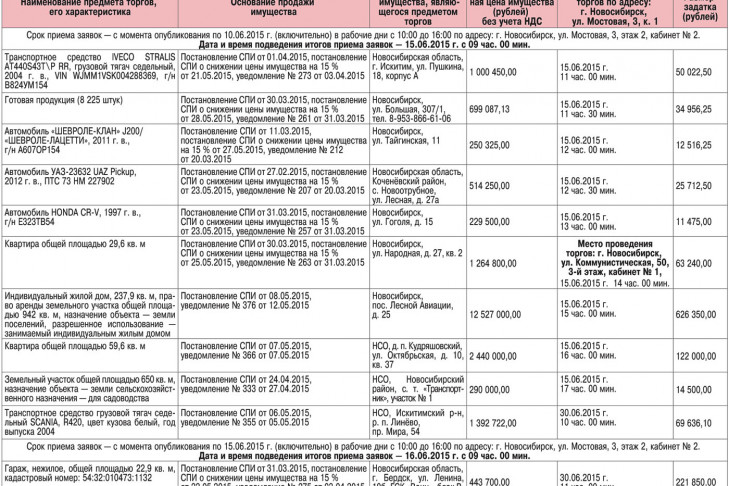 Организатор торгов — Территориальное управление Росимущества в Новосибирской области в лице Общества с ограниченной ответственностью «Колибри» (ИНН 5406654042, ОГРН 1105476098804), действующего на основании государственного контракта от 15.01.2015 г. № ТУ-201501/011 (юридический адрес: г. Новосибирск, ул. Коммунистическая, д. 50, офис 501, тел. 8 (383) 249-68-01), сообщает о проведении торгов в форме открытого аукциона по продаже арестованного (заложенного) имущества - см. Таблицу 1.