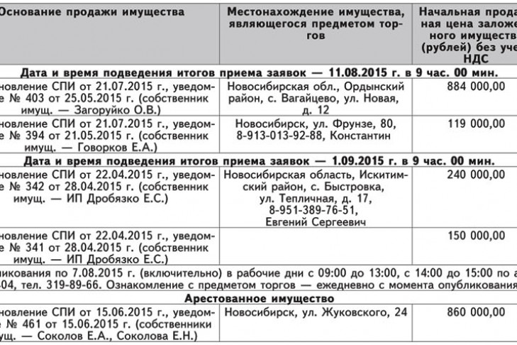 Срок приема заявок — с момента опубликования по 12.08.2015 г. (включительно) в рабочие дни с 09:00 до 13:00, с 14:00 до 15:00 по адресу: г. Новосибирск, ул. Кропоткина, д. 271, этаж 4, кабинет № 404. Тел. 319-89-66. Ознакомление с предметом торгов — ежедневно с момента опубликования сообщения самостоятельно.
