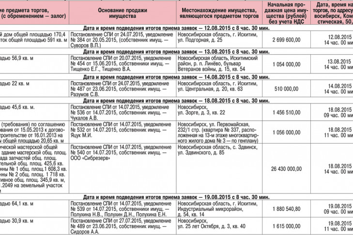 Срок приема заявок — с момента опубликования по 10.08.2015 (включительно) в рабочие дни с 9:00 до 13:00 по адресу: г. Новосибирск, ул. Коммунистическая, 50, этаж 3, кабинет № 6. Ознакомление с предметом торгов — ежедневно с момента опубликования сообщения самостоятельно.