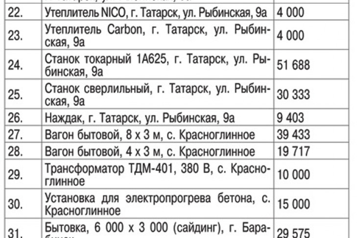 Организатор торгов — ООО «Свифт» (ИНН 5406575400, ОГРН 1145476165746, КПП 540601001, 630005, г. Новосибирск, ул. Каменская, 53, а/я 101; тел. (383) 291-57-13, факс 335-76-01; 2915713@bk.ru) сообщает о проведении торгов по продаже указанного ниже имущества организации-банкрота — открытого акционерного общества «Корпорация «СтройСиб» (далее — должник, адрес: 633261, НСО, р. п. Ордынское, ул. Октябрьская, 92, ИНН 5434114715, ОГРН 1025404497502, КПП 543401001, признано банкротом решением Арбитражного суда Новосибирской области от 25.02.2015, дело № А45-14572/2014) - см. Таблицу 1.