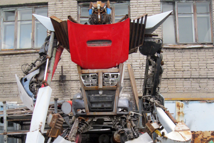 Пятиметровый железный монстр восстал из сварочной на улице Воинской в Новосибирске. Вооруженный гигантской пушкой, он замер в пружинящей позе. Мгновение — и титан бы отодвинулся от стены двухэтажного дома. Но люди оказались предусмотрительны, забетонировав могучие ступни двухтонного автобота.