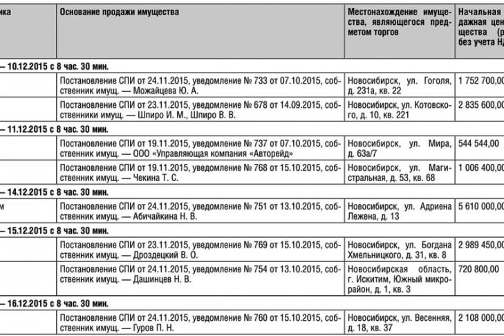Организатор торгов — Территориальное управление Росимущества в Новосибирской области (г. Новосибирск, ул. Революции, д. 38, тел. 223-28-54) — сообщает о проведении публичных торгов в форме открытого аукциона по продаже арестованного (заложенного) имущества (см. Таблицу 1).