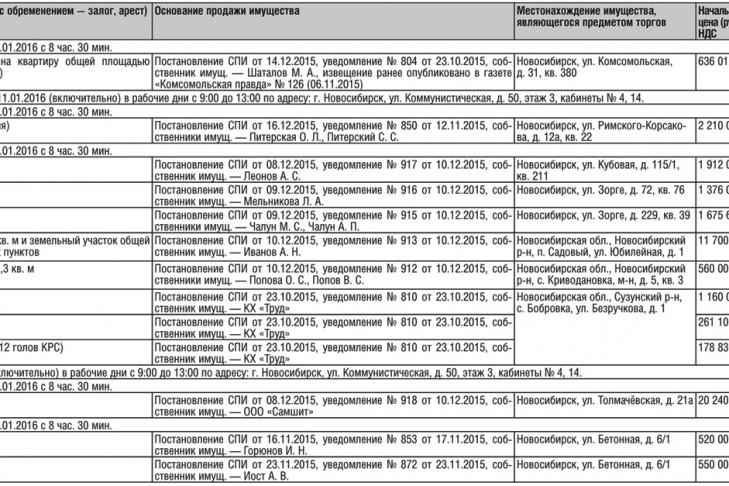 Территориальное управление Росимущества в Новосибирской области (г. Новосибирск, ул. Революции, д. 38, тел. 218-88-40) сообщает о проведении публичных торгов в форме открытого аукциона по продаже арестованного (заложенного) имущества по адресу: г. Новосибирск, ул. Коммунистическая, д. 50, 3-й этаж, каб. 1. Ознакомление с предметом торгов — ежедневно с момента опубликования сообщения самостоятельно (см. Таблицу 1).
