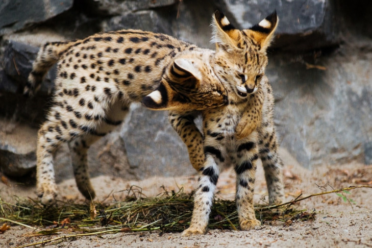 Уже немного подросли, выходят с мамой на прогулки и активно осваивают окружающее пространство  детеныши сервала. Пятнистые и ушастые — они размером не больше домашних котят, но даже в таком нежном возрасте видно, что это экзотическая, необычная кошка.