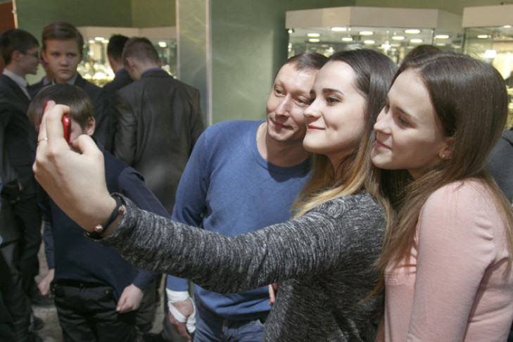 Следуют вопросы, ответы, но долго держать внимание ребят не удается, им не терпится сделать селфи с Евгением Подгорным. И фон рядом — целая стенка кубков — очень даже подходящий. Снимают Подгорного в итоге и слева, и справа, и со всей гурьбой мальчишек и девчонок.