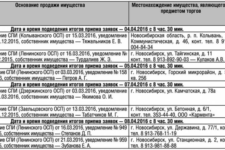Организатор торгов — Территориальное управление Росимущества в Новосибирской области (г. Новосибирск, ул. Революции, д. 38, тел. 218-88-40) — сообщает о проведении публичных торгов в форме открытого аукциона по продаже арестованного (заложенного) имущества. от 31.03.2016