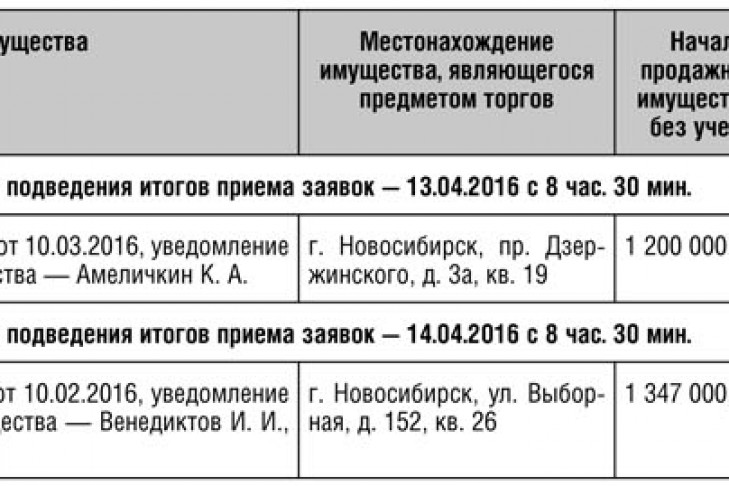 Организатор торгов — Территориальное управление Росимущества в Новосибирской области (г. Новосибирск, ул. Революции, д. 38, тел. 218-88-40) — сообщает о проведении публичных торгов в форме открытого аукциона по продаже арестованного (заложенного) имущества (см. Таблицу 1).