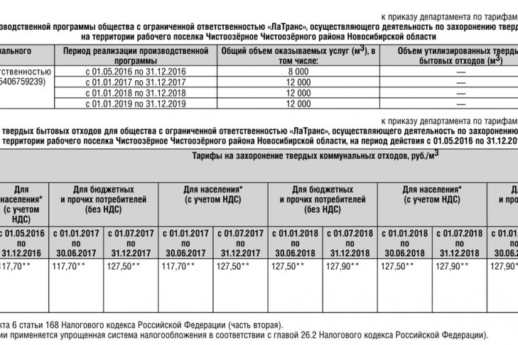 1. Согласовать производственную программу в сфере утилизации (захоронения) твердых бытовых отходов на услуги по захоронению твердых коммунальных отходов для общества с ограниченной ответственностью «ЛаТранс», осуществляющего деятельность по захоронению твердых коммунальных отходов на территории рабочего поселка Чистоозёрное Чистоозёрного района Новосибирской области, в том числе основные показатели производственной программы, согласно приложению № 1 (см. таблицу 1).