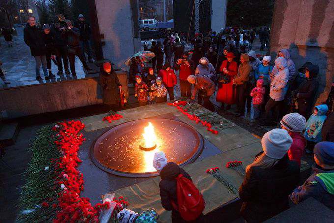 Вечный огонь засверкал тысячами маленьких огоньков. «Свеча памяти» - акция международная. Участники, в основном молодежь, по всему миру зажигают свечи в память о 27 млн погибших в Великой Отечественной войне русских солдатах. Из Новосибирской области не вернулось с линии фронта более 200 тысяч жителей. Имена 32 тысяч из них вписаны в скорбные пилоны на Монументе Славы.