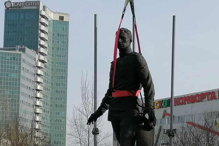 Сейчас шестиметровый бронзовый монумент, который вчера сняли с пьедестала,  отмывают с помощью специальных растворов. На новом месте фигура легендарного аса появился к 9 Мая.