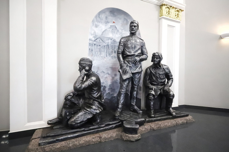 Скульптурные фигуры установлены в арке на парадной лестнице бывшего гарнизонного дома офицеров. Связист, танкист и офицер на фоне Рейхстага символизируют бойцов сибирских дивизий и других воинских частей и соединений, которые были сформированы в Новосибирске.