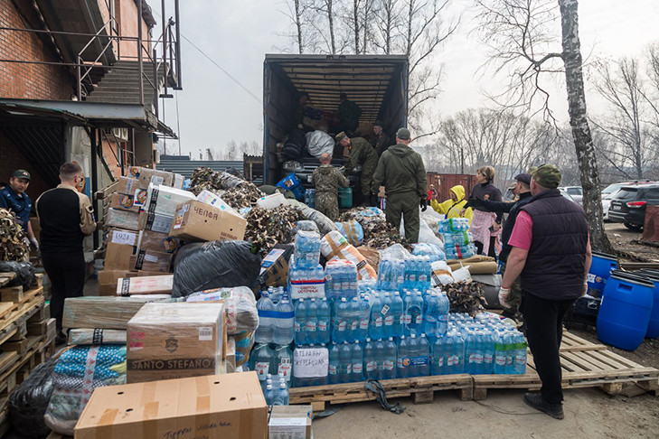 На основном складе фонда в воскресенье, 13 апреля, было шумно: люди в военной форме и в штатском помогали друг другу уложить в большегрузную машину очередную партию гуманитарки. Вот суповые наборы в пластиковых бочках, вот маскировочные сети в тюках и вода целыми упаковками. Среди прочего — несколько обычных ковров. На вопрос «зачем это там?» знатоки отвечают: землянки выстилать.
