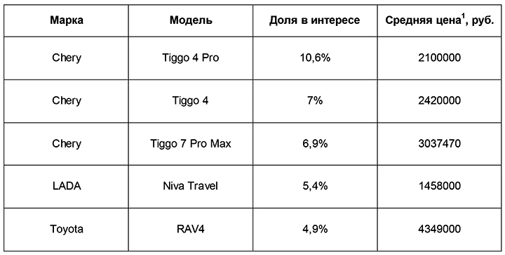 Самой популярной моделью в первом квартале этого года стал Chery Tiggo 4 Pro (10,6%). Кроме него в топ-5 попали Chery Tiggo 4 (7%), Chery Tiggo 7 Pro Max (6,9%), LADA Niva Travel (5,4%) и Toyota RAV4 (4,9%).
