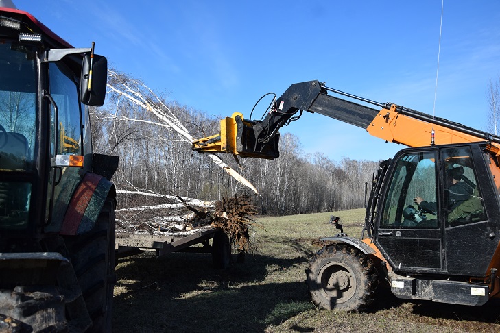 Работают телескопический погрузчик, специально приобретённый в прошлом году, и трактор с телегой. Погрузчиком управляет Сергей Дорогов, а трактором – Николай Быков. Расчистка идёт без заминок. Механизаторы опытные, работают слаженно и продуктивно. Должен быть ещё один трактор для раскорчёвки, но у него по пути на поле пробило колесо.