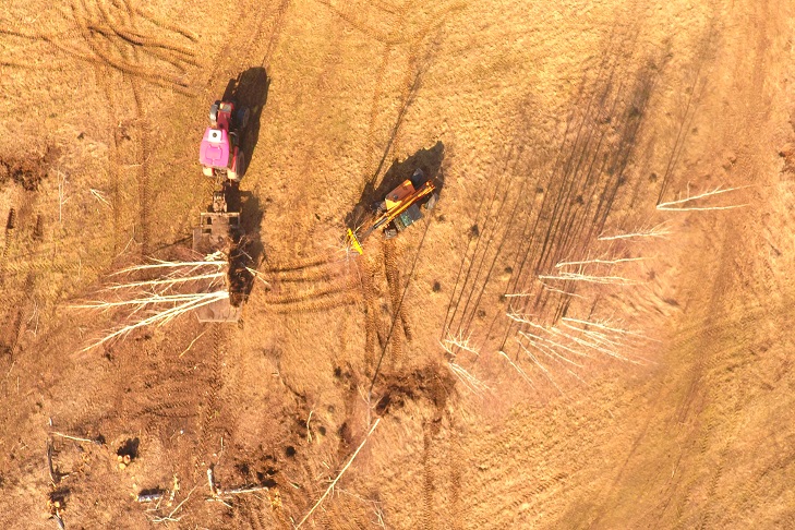 Здесь работает старый, но мощный бульдозер ЧТЗ Т-170 под управлением Юрия Гаранина. Опытный механизатор умело управляется с тяжёлой техникой, ловко сгребая в сторону уже раскорчёванные березы. На соседнем поле вырванный березняк в кучи собирает трактор под управлением Сергея Карпова. Потом сюда заедет Юрий на бульдозере.