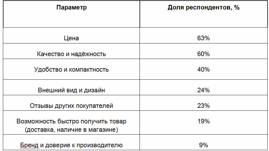 При выборе товаров особое внимание уделяется их стоимости — так ответили 63% респондентов. Чуть меньше опрошенных (60%) назвали качество продукции определяющим фактором при принятии решении о покупке. 40% участников опроса оценивают удобство и компактность, 24% – внешний вид и дизайн. На отзывы других покупателей обращают внимание 23% респондентов, возможность быстро получить товар учитывают 19% покупателей.