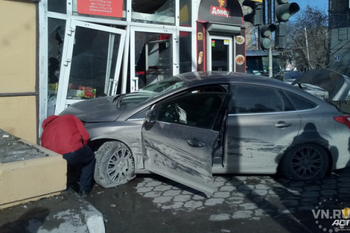 Черный Ford Focus протаранил вход в торговый павильон в Дзержинском районе Новосибирска. По счастливой случайности пешеходов в это время на тротуаре не было.