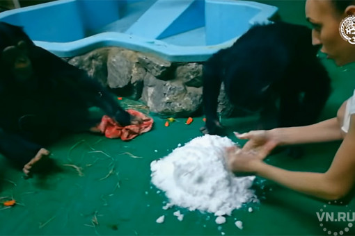Познакомились со снегом молодые шимпанзе Филя и Люся в Новосибирском зоопарке. В дикой природе этим приматам снег не встречается, и обезьянки восприняли новинку настороженно.