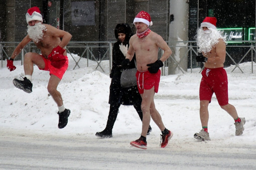 В субботу, 20 декабря, в центре Новосибирска устроили необычное зрелище несколько десятков любителей закаливания, наряженных в костюмы Дедов Морозов и Снегурочек. Новогодний забег не по-зимнему одетых персонажей уже много лет подряд заряжает горожан праздничным настроением.