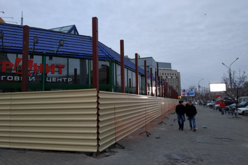 Забором обнесли демонтируемый зеленый рынок «Гранит» на площади Маркса. Утром во вторник пешеходам пришлось идти до метро по узкому куску тротуара. Создание выделенного входа в метро запланировано на третьем этапе строительства, пока только начинается первый.
