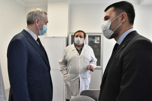 Губернатор Андрей Травников и Председатель Законодательного Собрания Новосибирской области Андрей Шимкив во время рабочей поездки в Краснозерский район оценили результат работ по реставрации корпуса поликлиники Центральной районной больницы.