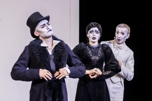 Черно-белый водевиль доехал до Новосибирска. Чеховскую пьесу-шутку «Медведь» в Санкт-Петербургском театре юных зрителей имени А. А. Брянцева поставили в эстетике немого кино с песнями и танцами. Спектакль уже видели на множестве международных фестивалей, в Новосибирске зрителей «Медведя» пригласили прямо на сцену.