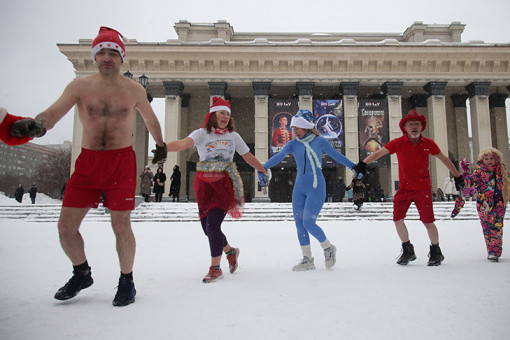 В субботу, 20 декабря, в центре Новосибирска устроили необычное зрелище несколько десятков любителей закаливания, наряженных в костюмы Дедов Морозов и Снегурочек. Новогодний забег не по-зимнему одетых персонажей уже много лет подряд заряжает горожан праздничным настроением.