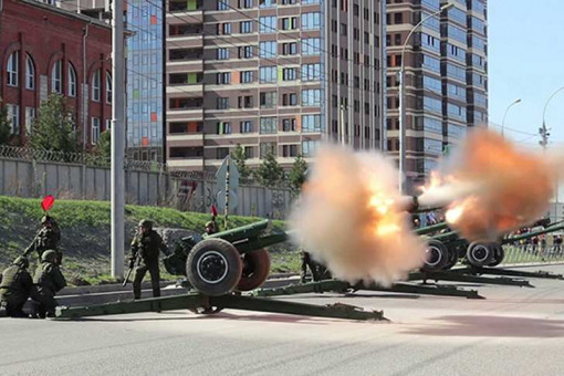 В районе Ипподромской магистрали артиллеристы отработали элементы вождения салютных установок на ограниченной площадке и порядок при выполнении выстрелов из орудий.