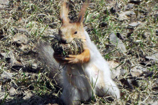 Грызуна за несвойственным ему занятием – строительством гнезда – сфотографировал житель Новосибирска. Белка переносила сухую траву с газона на крону дерева, где, по всей видимости, на свет появится беличье потомство.
