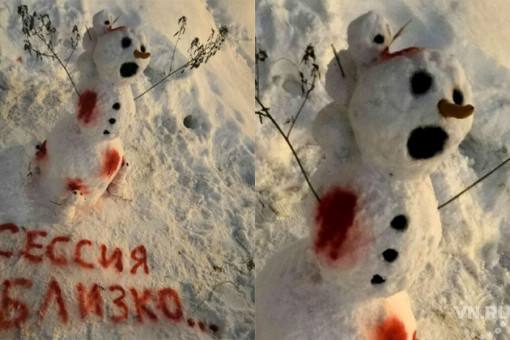 Душераздирающую картину могут наблюдать прохожие, чей маршрут пролегает рядом с общежитием №6 НГТУ в Новосибирске. Их встречает окровавленный снеговик.