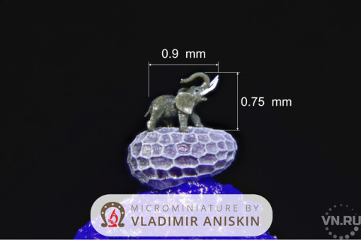 Микроминиатюрист из Новосибирска Владимир Анискин попал в Книгу рекордов России благодаря миниатюрному слону, которого он сделал. Композиция представляет собой слона размером 0,90х0,75 мм, стоящего на маковом зернышке.