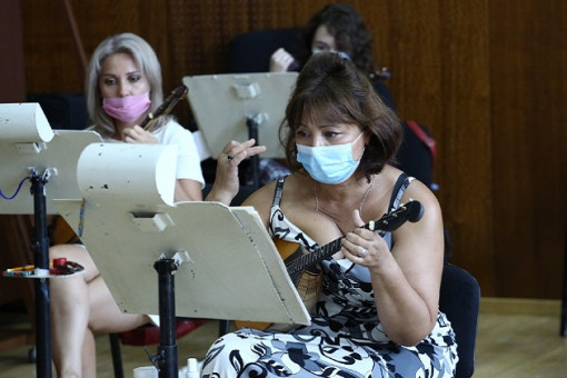 В защитных масках к репетициям приступили артисты Новосибирской филармонии, несколько месяцев просидевшие по домам из-за коронавируса. Большие коллективы разделили на части, чтобы люди могли держать дистанцию 1,5 метра друг от друга и репетировать в разное время. Первые концерты начнутся уже в начале сентября.