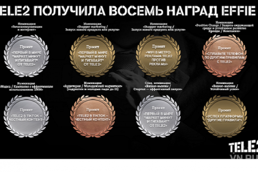 Tele2, альтернативный оператор мобильной связи, завоевал восемь наград престижной премии Effie Awards Russia, которая вручается за достижения в области маркетинга и рекламы в России. Проекты Tele2 отметили в семи номинациях: оператор завоевал три золота, три серебра и две бронзы. Наградами высшего достоинства члены жюри отметили коммуникационную платформу «Другие правила», один из первых в мире маркетов гигабайтов и минут. Также Tele2 признали одним из самых эффективных брендов на рекламном рынке страны: в рейтинге Effie Russia Effectiveness Index оператор занял второе место.