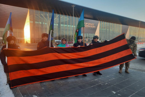 Георгиевская лента длиной в 9 метров объехала всю линию фронта специальной военной операции и вернулась в Новосибирск. Бойцы спецподразделений оставили на ней свои автографы и приветы с передовой.