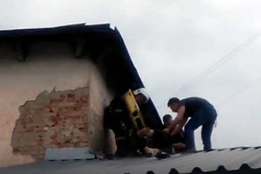 Утром в Новосибирске мужчина попытался убежать от спасателей и спрыгнул на пристройку к дому, затем опять попытался забраться на крышу, подтянувшись на руках. В этот момент сотрудникам полиции удалось схватить дебошира.