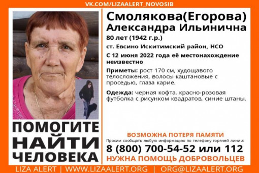 80-летняя Александра Ильинична Смолякова пропала 12 июня на станции Евсино в Искитимском районе. Добровольцы поискового отряда просят помощи у пассажиров электричек, проезжавших в тот день мимо.