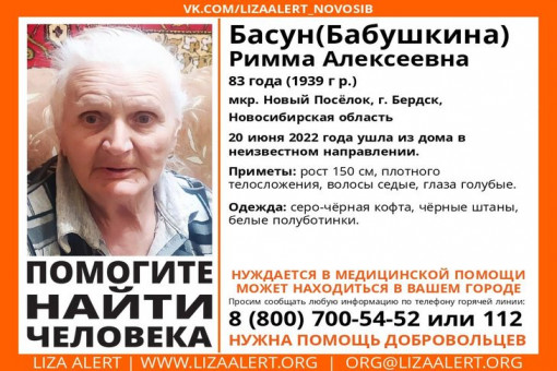 Басун (Бабушкину) Римму Алексеевну 1939 года рождения ищут вблизи микрорайона Новый поселок под Бердском. Пожилая женщина 20 июня ушла из дома в неизвестном направлении и не вернулась.