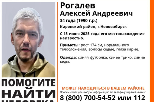 В Кировском районе Новосибирска шесть дней назад бесследно исчез 34-летний Алексей Рогалев. Поисковый отряд «Лиза Алерт Новосибирск» просит сообщить об его местонахождении.