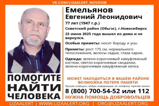Помощь добровольцев требуется для поисков 77-летнего новосибирца. Человек ушел из дома и не вернулся 23 июня.