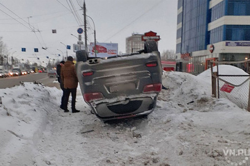 Кроссовер KIA опрокинулся и оказался на тротуаре – ДТП произошло днем 19 февраля в Ленинском районе Новосибирска. По счастью, в этот момент там не было пешеходов.