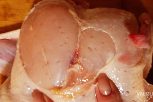 Непрезентабельного вида курицу продали покупателю на одном из рынков Новосибирска. После разморозки она потеряла в весе и показала дефекты на коже.
