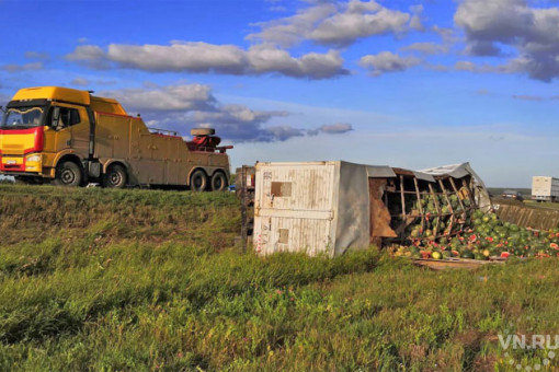 Арбузы высыпались из грузовика, завалившегося набок на трассе в Новосибирской области. Пользователей соцсетей поразило, какие красивые фотографии получились в места аварии.